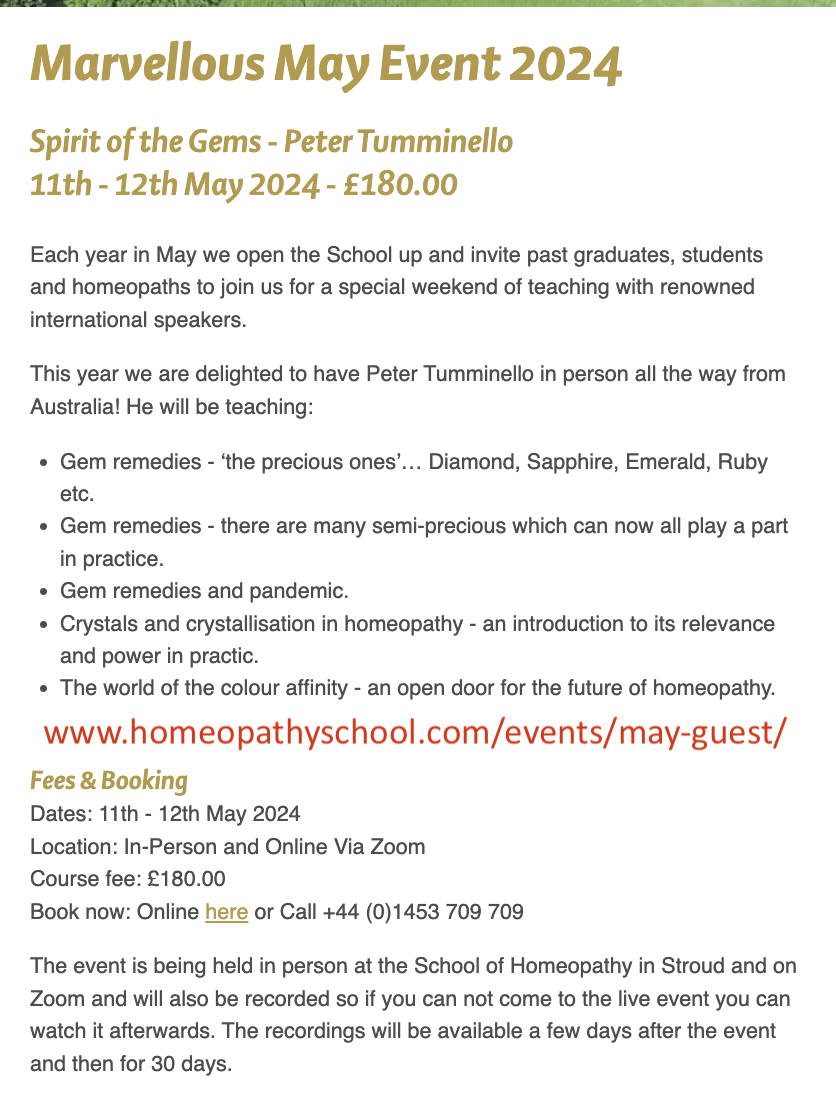 Live Course: ‘Spirit of the Gems’. School of Homeopathy, Stroud, United Kingdom. May 2024.